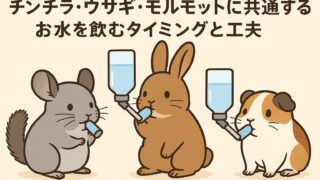 快適な暮らしと環境づくり チンチラ・うさぎ・モルモットに共通するお水を飲むタイミングと工夫 チンチラがお水を飲むのは運動後や食後が多いです。うさぎやモルモットなど小動物にも共通する飲水のタイミングや、水分不足対策、膀胱炎予防の工夫を解説します。 2025.10.07 快適な暮らしと環境づくり
